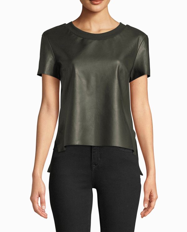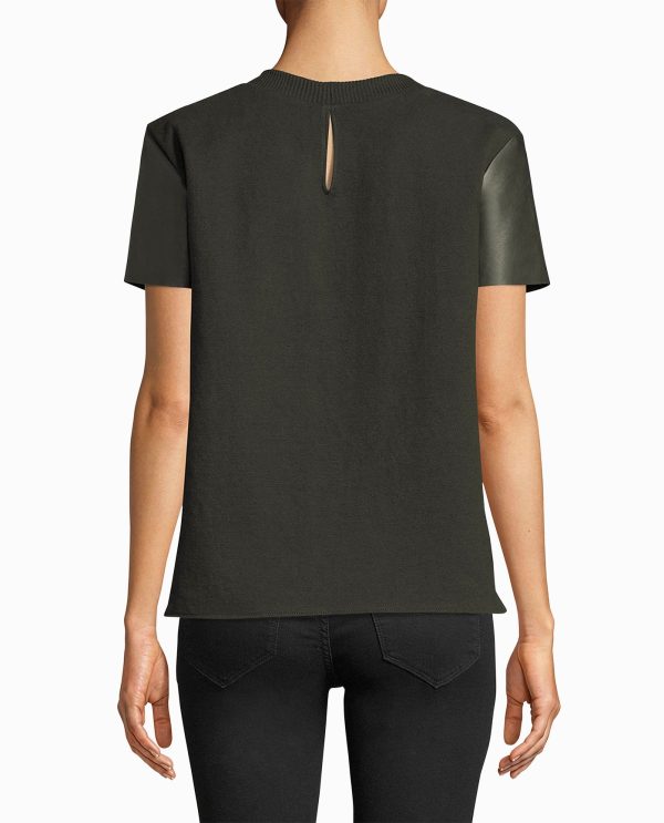 LEATHER GOES A LONG WAY. THIS SHORT SLEEVE TOP IS CRAFTED WITH OUR LUXURIOUS LEATHER AND COOLING COTTON. THE DOUBLE-FABRIC CREATES A DOUBLE MOOD: REBELLIOUS AND UNDERSTATED.